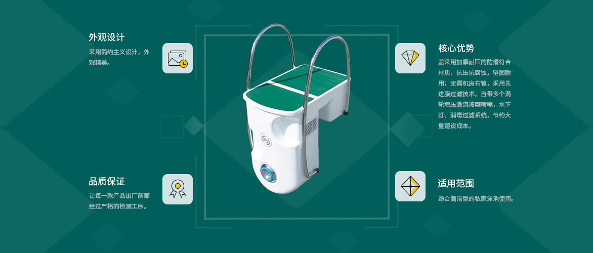 AQUA愛克泳池設備旗下的掛壁式一體機機蓋采用加厚耐壓的防滑復合材質,人性化設計,舒適安全。