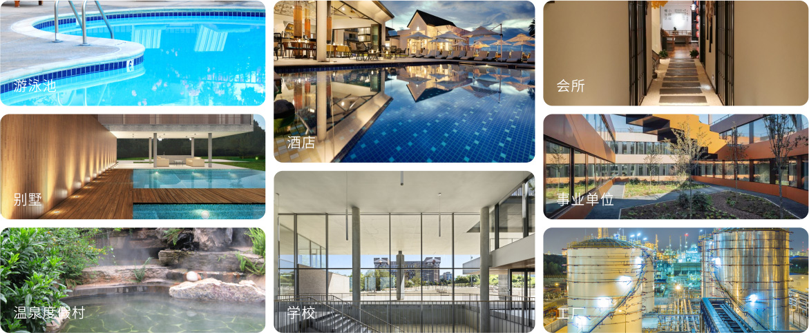 廣泛應用于游泳池、溫泉、度假村、酒店、會所、別墅、工廠、學校、政府機關單位等需除濕、恒溫的領域
