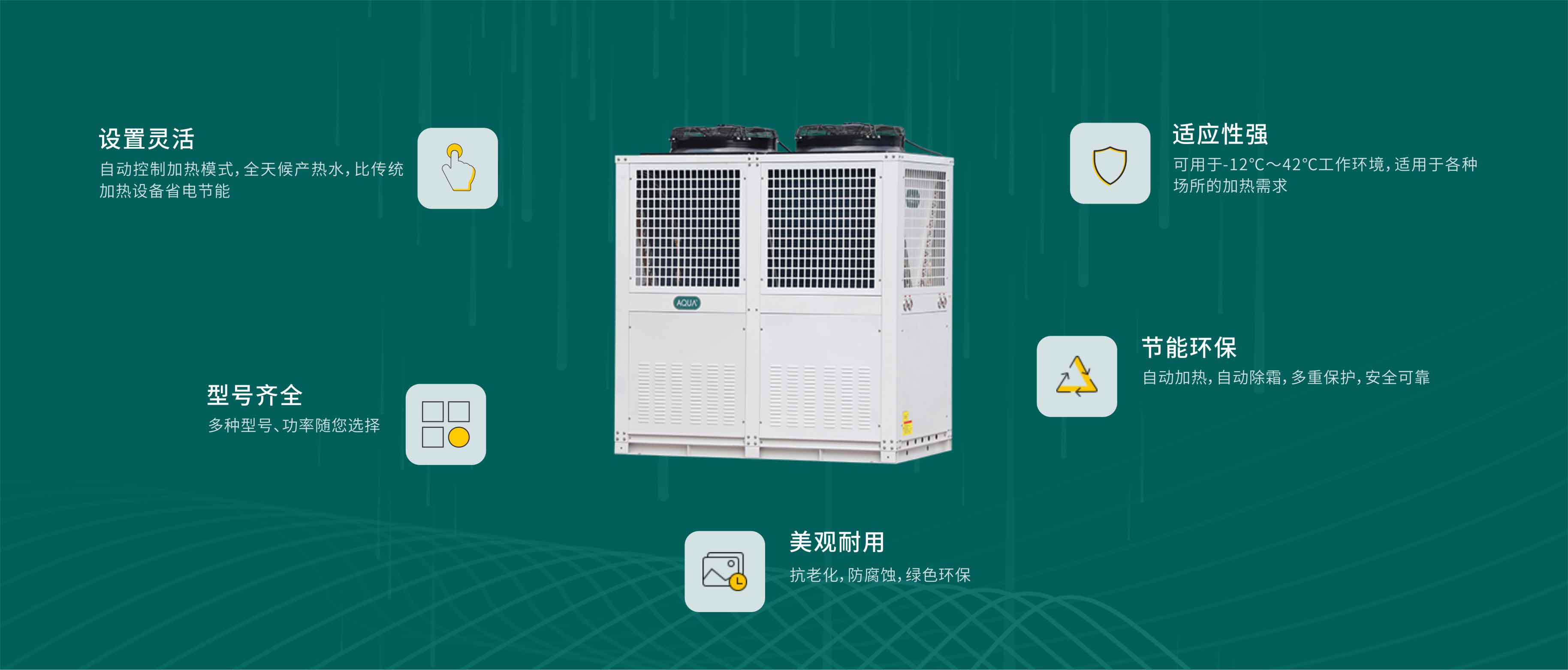 外觀優(yōu)雅、大氣,抗老化、耐腐蝕。全天候可靠工作??諝庠礋岜檬且环N從低溫?zé)嵩次崃?,使其在較高溫度下轉(zhuǎn)換為可利用能源的高效率的環(huán)保節(jié)能型產(chǎn)品。