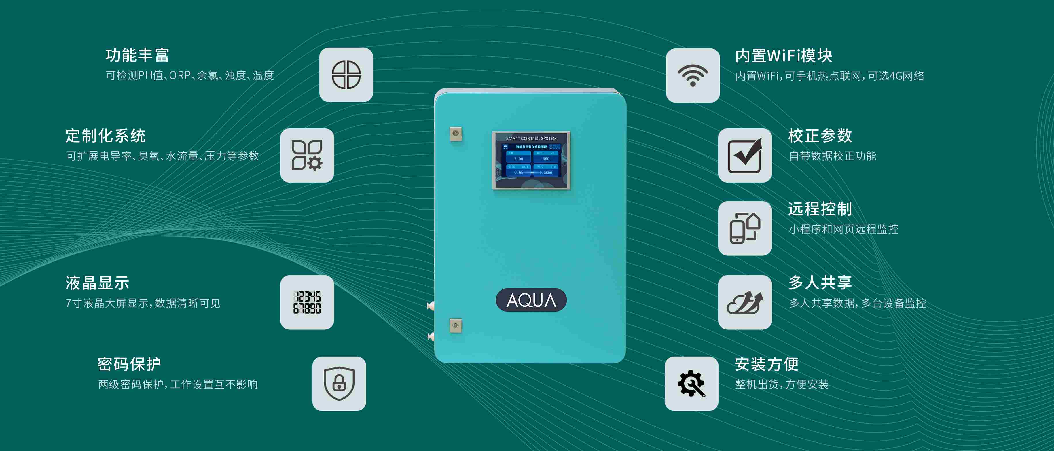 AQUA愛克泳池設備旗下水質監控儀(AUT-3000)可監測PH值、ORP、CL、濁度、溫度等多項參數。