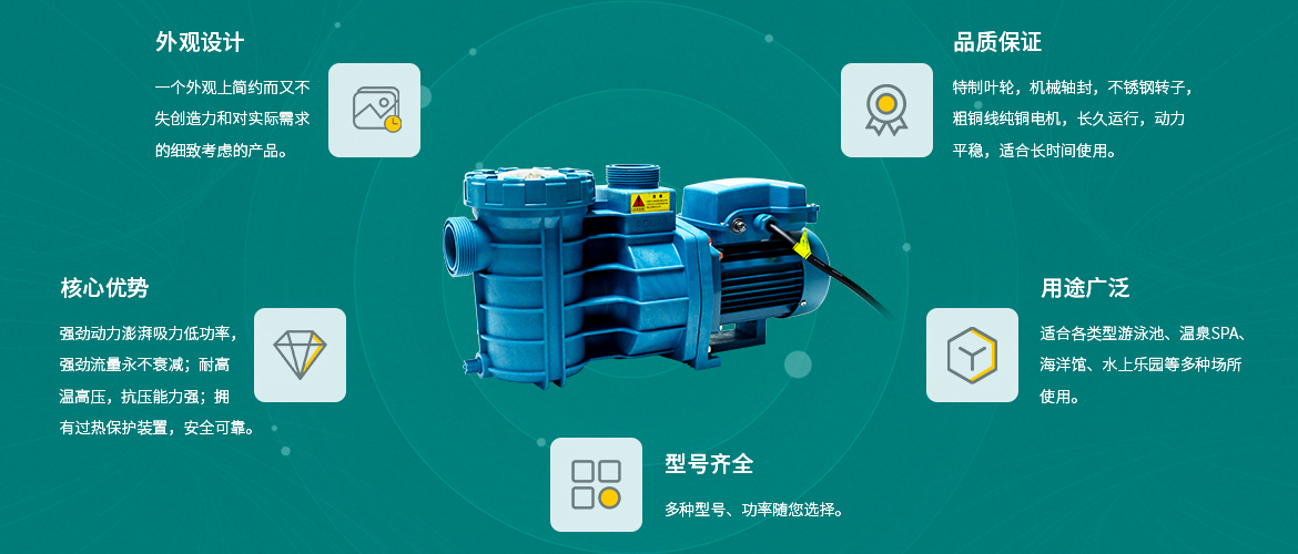 The ABS series water pump has an innovative internal design and large self-suction. The pump body is made of special materials and can bear pressure of 6kg/cm2. It can be used at 70℃ high temperature. It is used in swimming pools, hot springs SPA, aquariums, water parks and other places.