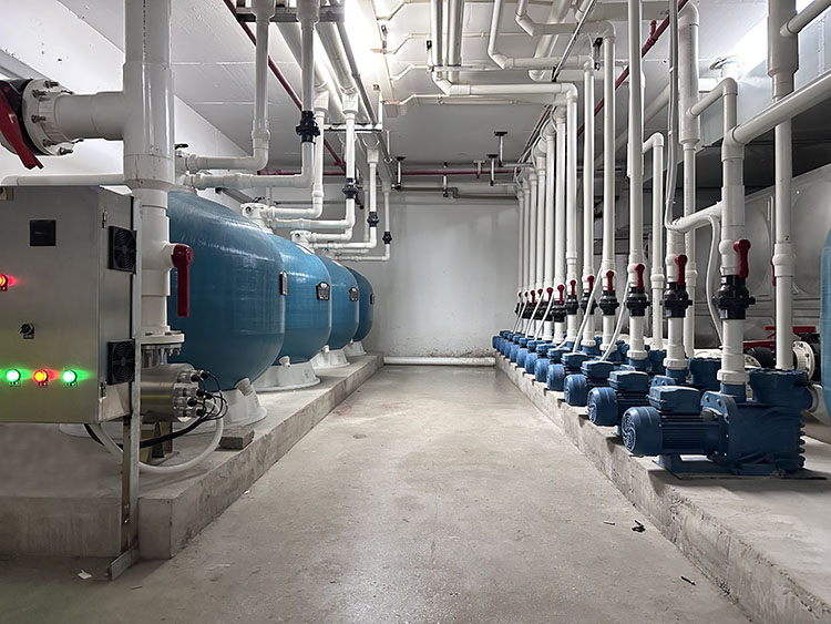 在循環過濾系統方面,其核心是泳池循環水泵與過濾砂缸。循環水泵采用高效節能電機,流量穩定且噪音低,可根據泳池面積自動調節運行功率;過濾砂缸內部填充優質石英砂,通過多層過濾結構可有效攔截水中懸浮物、膠體等雜質,過濾精度高達5-10微米,能持續保障水質清澈。